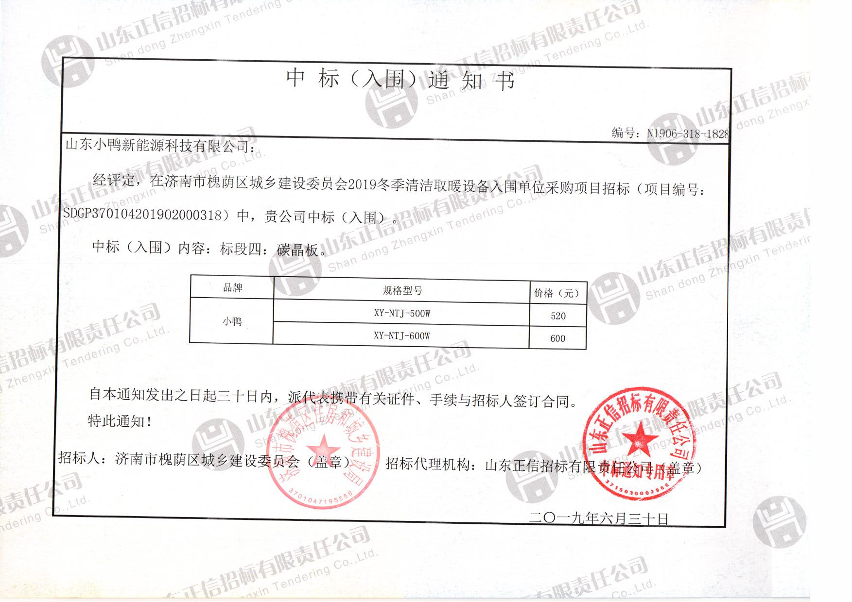 瀏覽量:0近日,濟(jì)南槐蔭區(qū)城鄉(xiāng)建設(shè)委員會關(guān)于2019冬季清潔取暖設(shè)備入圍單位采購中標(biāo)結(jié)果正式公布,小鴨新能源家用電鍋爐、碳晶板、蓄熱式電暖器三款“煤改電”產(chǎn)品成功入圍,充分顯示了小鴨新能源的企業(yè)實(shí)力與超強(qiáng)的競爭力,更展示了大家對小鴨品牌影響力的高度認(rèn)可。